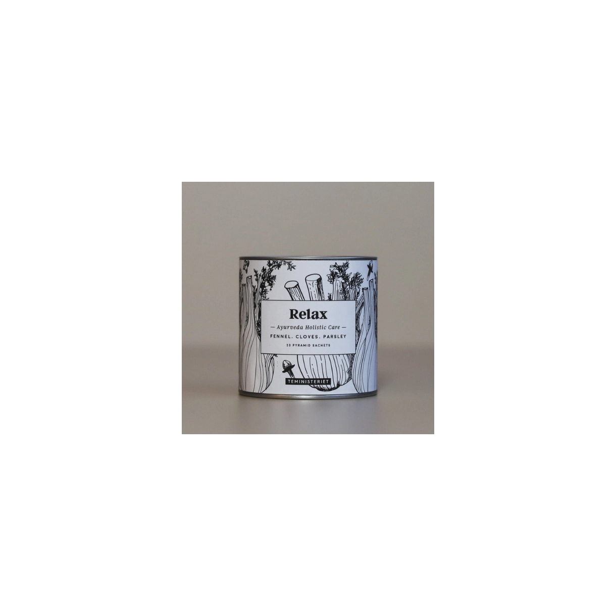 Teen Relaxe fra Teministeriet, kommer i den fineste lille tindåse med 20 pyramide-teposer. Teen har afslappende "egenskaber", og er god at nyde inden sengetid, eller hvis du blot ønsker lidt ro. Denne lækre te har en skøn smag af fennikel, ingefær, lakridsrod, pebermynte og citrongræs med et krydret twist af kanel, sort peber og nelliker.
