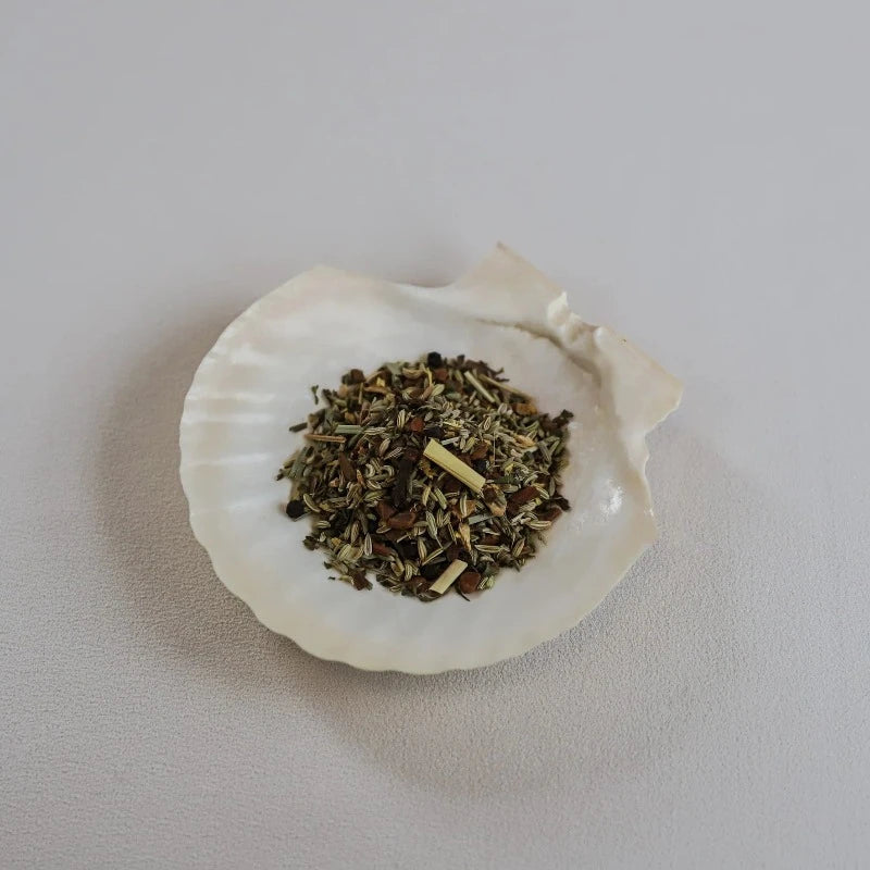 Ingrediensliste: Lakridsrod*, Fennikel*, Kanel*, Ingefær*, Citrongræs*, Sort peber*, Pebermynte*, Nelliker* og Persille*.